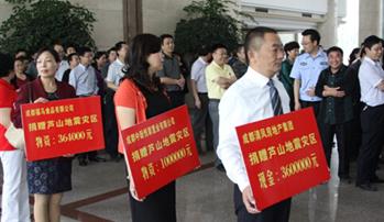 2013年4月20日08时02分,四川省雅安发生7.0级地震,震中位于芦山县,震源深度13公里,给当地造成严重的人员和财产损失。灾难牵动着清凤人的心,清凤人牵挂着灾区人民的抗震救灾及灾后重建,2013年4月25日,在“金堂县向芦山地震灾区捐款”的募捐现场,清凤集团董事长黄清平先生代表集团公司现场捐赠现金360万元善款,为地震灾区的人民献上清凤的一片爱心。